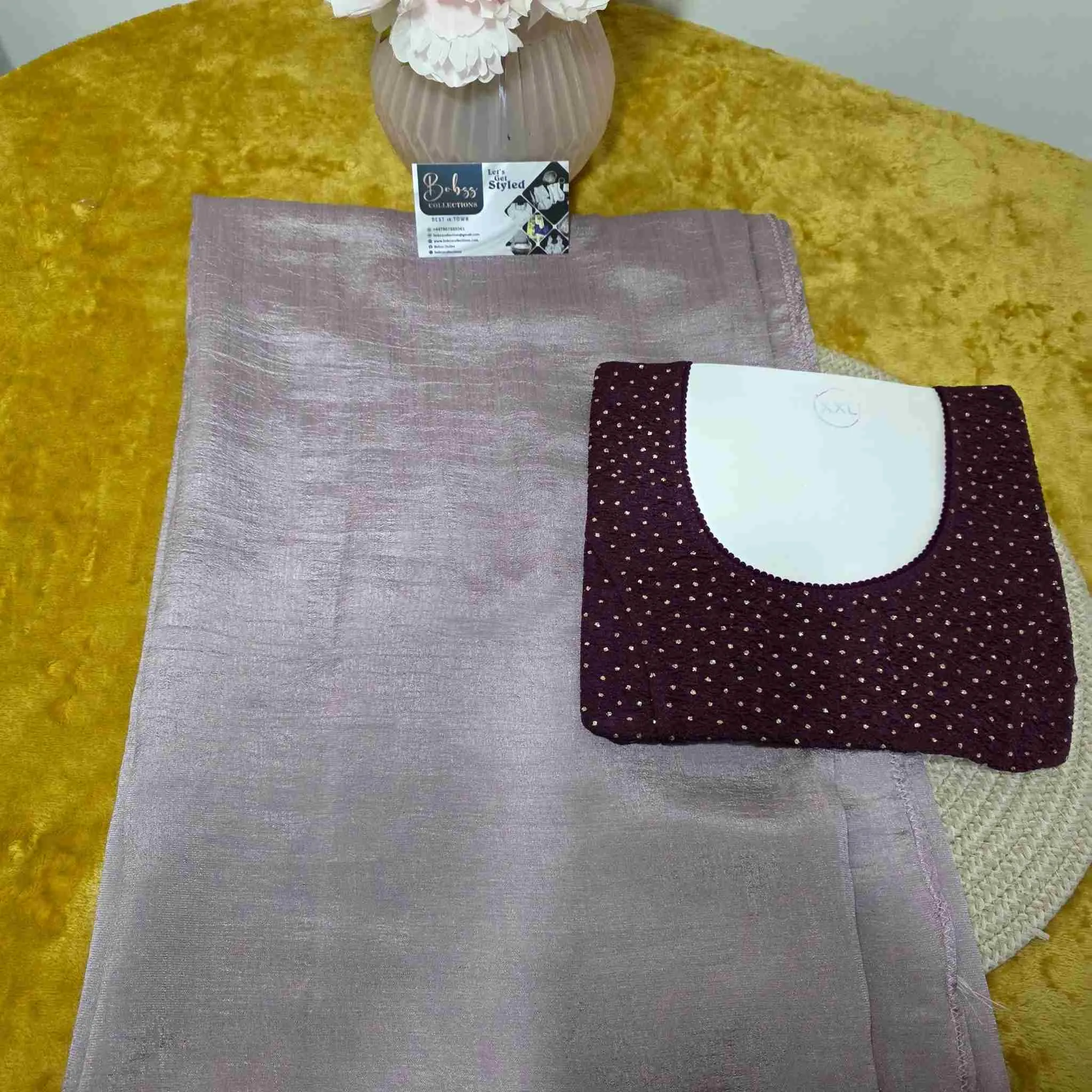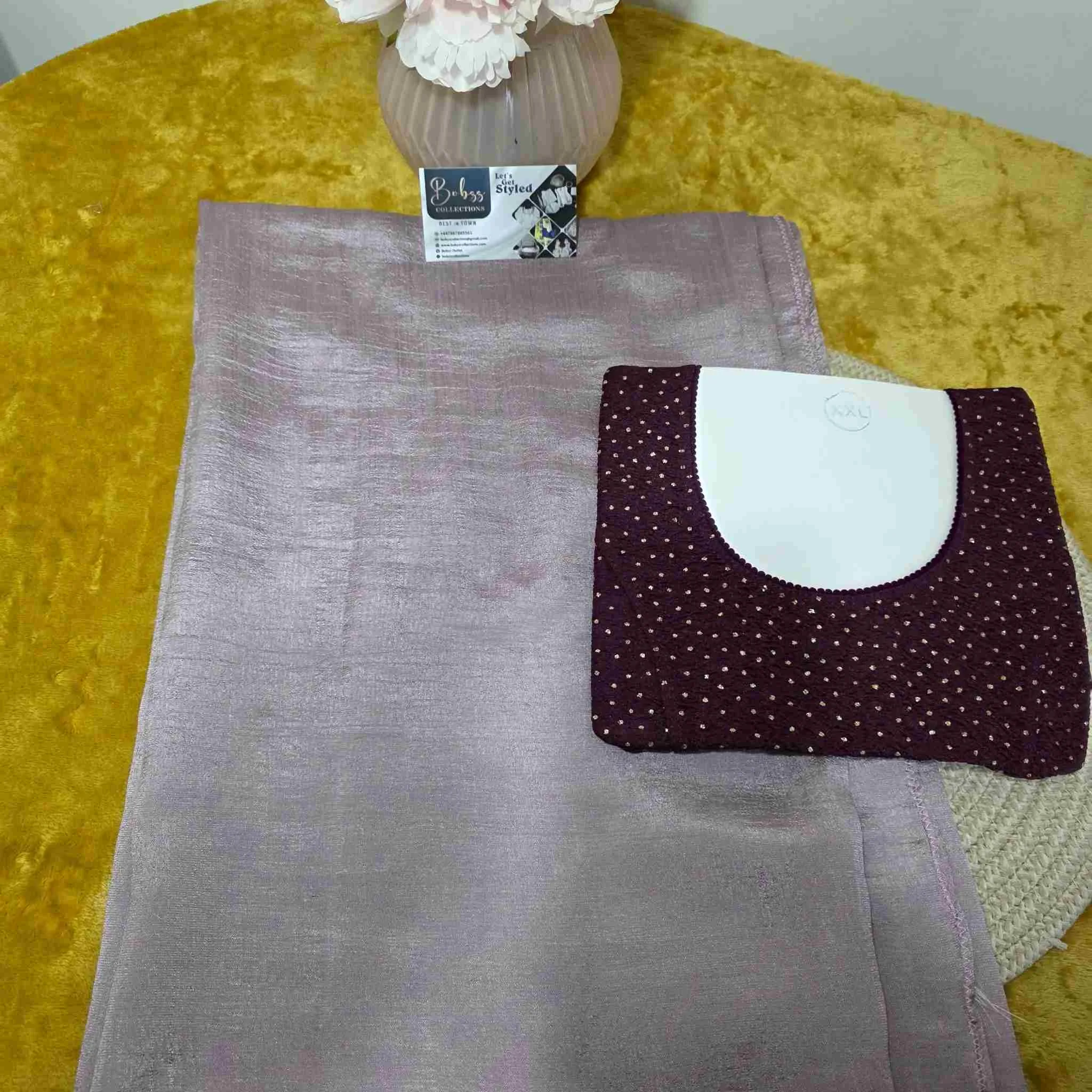 Modern elegance and comfort combined. This Deep Plum/Mauve Saree contrasts beautifully with the bold Maroon Polka Dot Blouse. The blouse is stretchable and fitted, offering a perfect ready-to-wear look for any event.